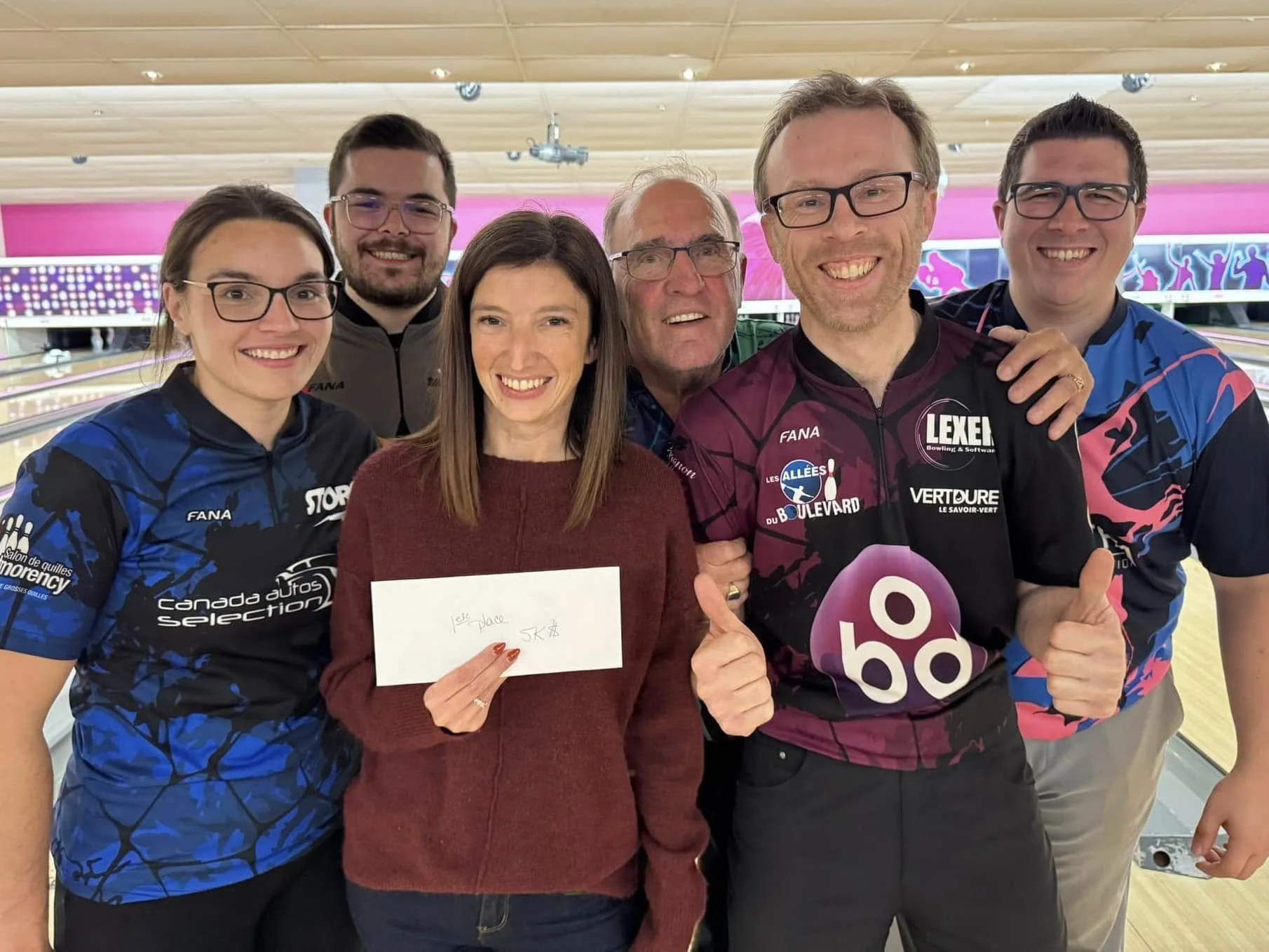Équipe championne 2024 : Andréanne Blouin, Alexandre Duchesne, Jacques Ouellet, Guillaume Nadeau et Anthony Carrier (avec Jennifer Tremblay, directrice du tournoi)